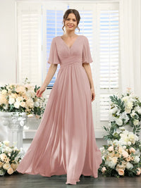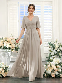 The gown is crafted from luxurious chiffon, featuring romantic butterfly sleeves and a flattering V-neckline. Its elegant, flowing silhouette makes it perfect for evening occasions and special moments.